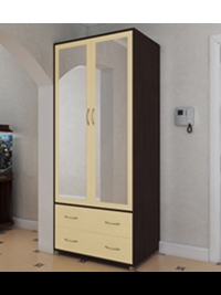 Внутри шкафа расположена длинная штанга для "плечиков", глубокие полки и два вместительных выдвижных ящика. Высокое зеркало на центрально двери шкафа делает его использование еще более удобным и приятным. Сдержанный дизайн этой модели дополняют изящные ручки.