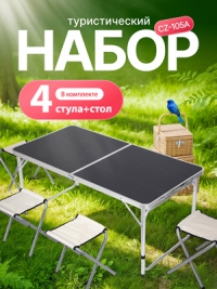 ностью. В набор входит стол из металла с прочной столешницей из МДФ, а также четыре раскладных стула с тканевым сиденьем. Набор легко хранить и перевозить.